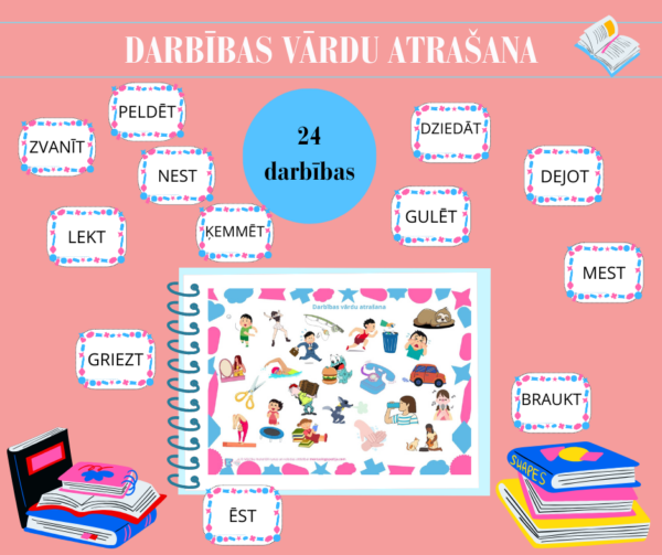 • Bērns izlasa vārdu vai pieaugušais lūdz parādīt attēlu ar konkrēto darbību