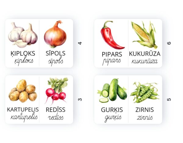 Dārzeņu kartiņas A5 formātā. 24 dārzeņu kartiņas. Materiāls 2 failos.