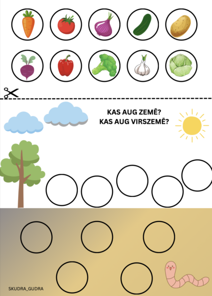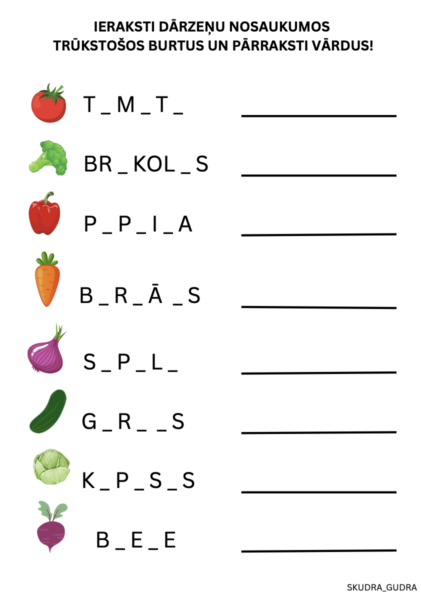 Mācību materiāls pirmsskolas 3. vecumposma bērniem. Uzdevums- nosaukt dārzeņus, izgriezt, ielīmēt atbilstoši to augšanas pozīcijai (virs zemes/zem zemes), ierakstīt trūkstošos burtus dārzeņu nosaukumos un pārrakstīt tos.
