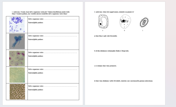 Ir ne tikai pdf formātā, bet arī docx, lai vajadzības gadījumā kaut ko varētu pamainīt, piemēram, no 1. uzdevuma var izdzēst attēlus un uzdot skolēniem pašiem shematiski uzskicēt 5 dzīvo organismu valstu šūnas, raksturot tās.