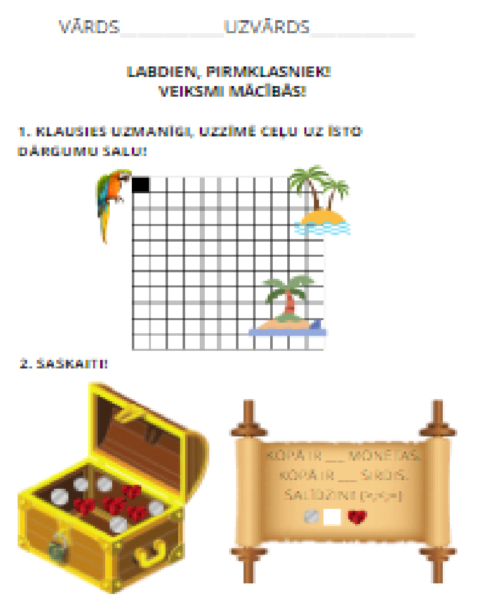 Neliela darba lapa pirātu noskaņās, kas ļauj saprast skolēna prasmes matemātikā uzsākot skolas gaitas.