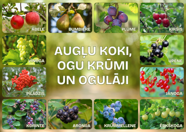Šis digitālais materiāls ir izglītojošs vizuālais resurss bērniem, kas palīdz iepazīt un atšķirt augļu kokus, ogu krūmus un ogulājus.