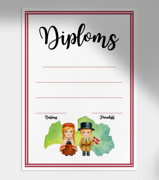 Komplekts ietver trīs gatavas diplomu veidnes ar uzrakstiem “Diploms”, “Atzinība” un “Pateicība”, kā arī vienu tukšu lapu ar vienādu dizainu — Latvijas karoga krāsās un ilustrāciju, kurā redzami tautastērpos tērpti bērni uz Latvijas kontūras fona.