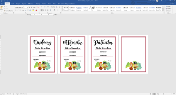 Materiāls sagatavots PDF formātā ērtai drukāšanai un Word failā, lai nepieciešamības gadījumā varētu ievadīt bērnu vārdus, pasākuma nosaukumu vai mainīt tekstu.