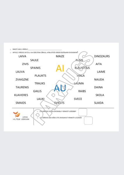 Uzdevumi darba lapās  – apvilkt vārdus ar norādīto divskani, ierakstīt atbilstošu divskani vārdā, saklausīt un savienot ar atbilstošu divskani vārdā.