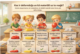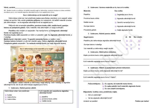 Darba lapa paredzēta 2. klases skolēniem un balstīta uz pētniecisko pieeju. Skolēni praktiski iepazīst deformācijas jēdzienu, veicot vienkāršu pētījumu ar dažādiem materiāliem (plastilīns, porolona trauku sūklis, metāla karote, gumijas balons, putuplasts). Darba gaitā skolēni izvirza minējumu, deformē materiālus, novēro izmaiņas un fiksē rezultātus. Skolēni salīdzina, kuri materiāli atgriežas sākotnējā formā un kuri saglabā jauno formu, kā arī formulē secinājumus. DL ietver uzdevumus dažādos izziņas līmeņos, pašnovērtējumu un refleksiju, veicinot izpratni par materiālu īpašībām, pētnieciskās prasmes un spēju skaidrot novērojumus.