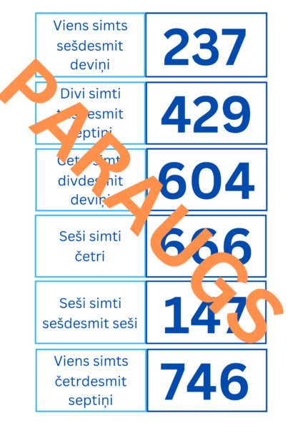 Šis mācību materiāls paredzēts matemātikas apguvei, attīstot skolēnu prasmi atpazīt un sasaistīt skaitļus ar to vārdiskiem apzīmējumiem. Komplektā ir 8 lapas, katrā 6 domino kauliņi – kopā 48 domino kauliņi. Materiāls aptver skaitļus līdz 1000, piedāvājot dažādas kombinācijas, kas veicina skaitļu izpratni un loģisko domāšanu.