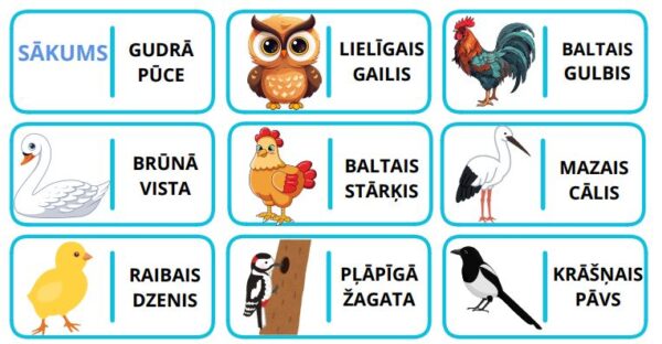 4  (putni, dzīvnieki, augi, skola) domino spēles lasītprasmes, lasītā teksta izpratnes pilnveidei.