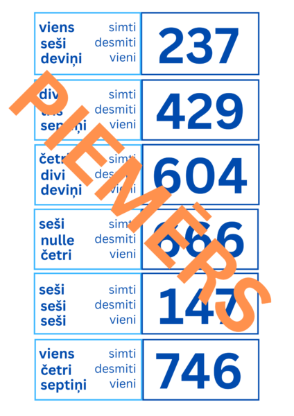 Šis domino komplekts palīdz skolēniem nostiprināt skaitļu lasīšanu un to sadalīšanu simtos, desmitos un vienos. Komplektā ir 8 lapas ar 48 domino kauliņiem, kur katrs skaitlis tiek attēlots gan ciparos, gan vārdiski sadalīts sastāvdaļās.