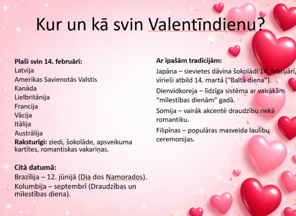 Prezentācija satur gan vēstuiskus notikumus (saistītos ar Valentīndienu), gan radošus uzdevumu skolēniem.