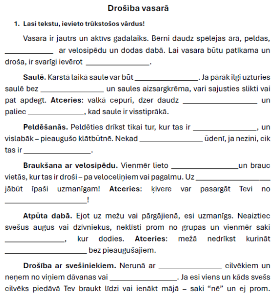 Darba lapa ar 3 uzdevumiem par drošību vasarā.