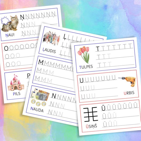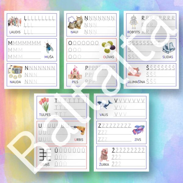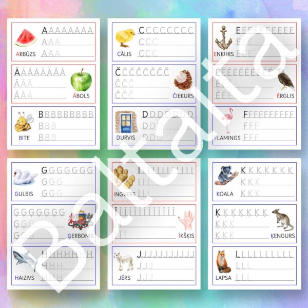 Darba lapu komplekts ar visiem 33 drukātajiem alfabēta burtiem to pārvilkšanai un rakstīšanai ar pievienotiem krāsainiem attēliem, kuri sākas ar šiem burtiem.