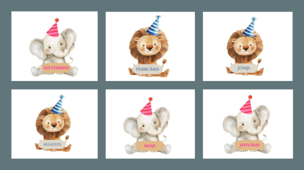12 dzīvnieciņi ar mēneša nosaukumiem, lai izmanotu kā grupas dzimšanas dienu kalendāru.