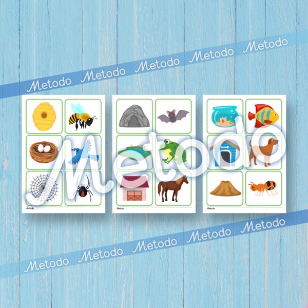 18 kartītes ar dzīvnieku un to māju attēliem.