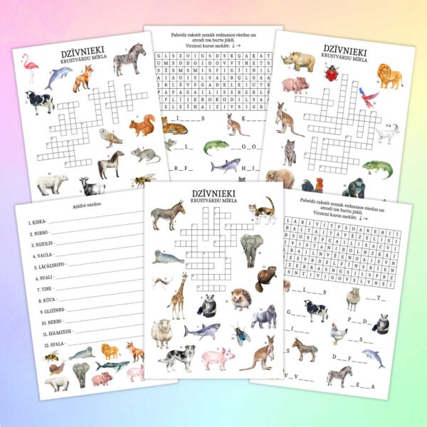 Šīs interesantās vārdu spēles ietver 3 krustvārdu mīklas, kurās vārdi minami pēc attēliem, divus burtu jūkļus – kuros būs jāuzraksta un tad jāatrod dzīvnieku nosaukumi, kā arī vārdu šifrēšanas darba lapa kurā jāatšifrē 12 dažādi vārdi, kuru burti ir sajaukti vietām.