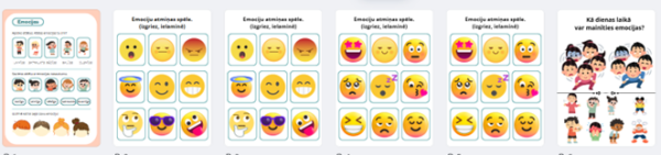 Spēle emociju atmiņas spēle. ( izgriež, ielaminē, pagriež tā lai nebūtu redzamas emocijas un sāk grozīt pa 2. ja vienādas paņem sev, ja dažādas atvēra pagriež atpakaļ.) kuram bus vairāk emociju pārus tas uzvarēja. Kā arī