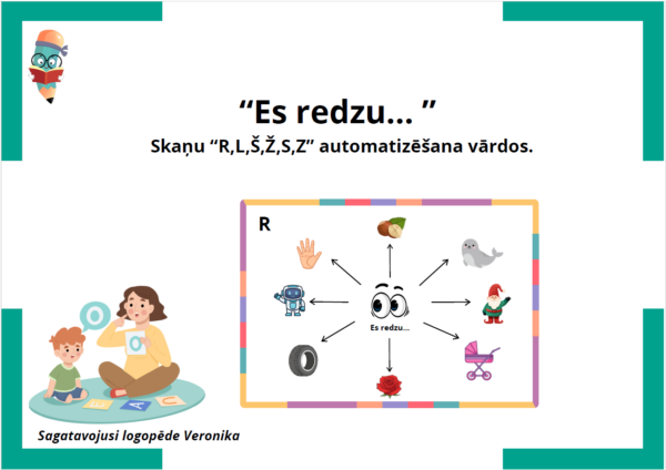 Metodiskais materiāls “Es redzu… ” ar primāru mērķi automatizēt skaņas skaņas R,L,Š,Ž,S un Z vārdos, kā arī pilnveidot prasmi veidot teikumus un lietot vārdus pareizajā formā.