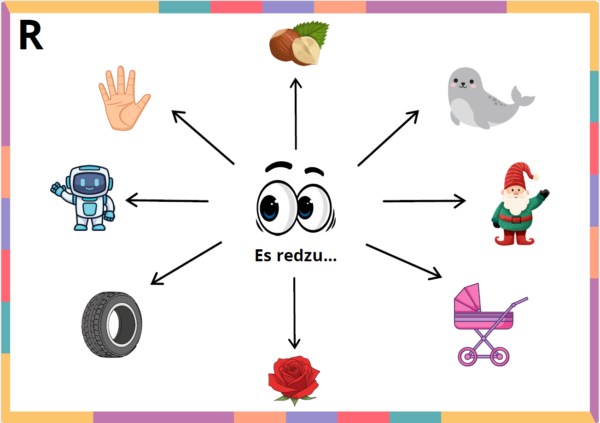 Bērns izvēlas attēlu, nosauc to un veido teikumu pēc parauga “Es redzu…”, īpašu uzmanību pievēršot skaņu pareizai izrunai.