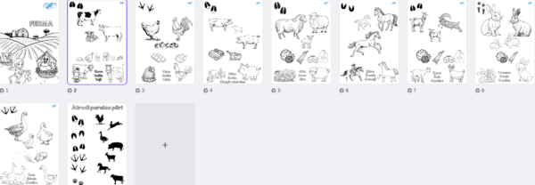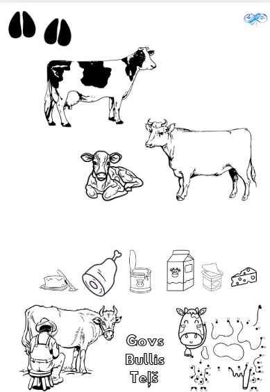 Ferma darblapas sastāv no 10 darba lapām. Katrā lapā bērns iepazīstas ar vienu dzīvnieku saimi, kas dzīvo saimniecībā (govs, bullis, teļš), un produktiem, ko mēs iegūstam no šiem dzīvniekiem. Bērns var tos izkrāsot, savienot dzīvnieka siluetu ar skaitļiem un uzrakstīt dzīvnieka nosaukumu. Darba lapā ir arī nagu nospiedumi, un pēdējā, 10. lapā bērnam ir jāsavieno nagu nospiedumi un dzīvnieka siluets.