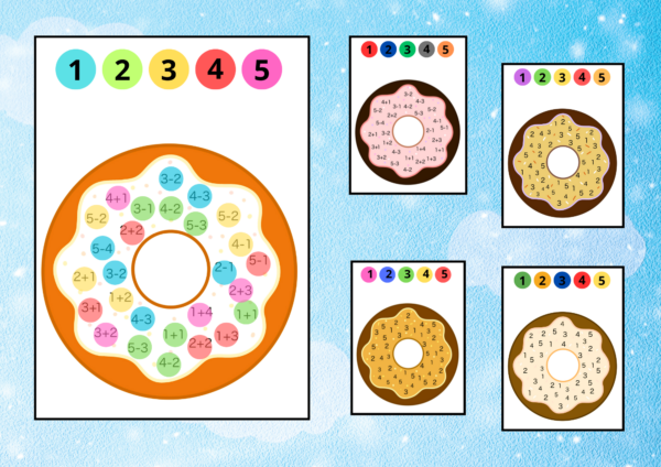 Komplektā 5 lapas ar jau dotām krāsām priekš katra cipara, 5 lapas, bez krāsām, lai paši var izvēlēties, kādas krāsas nepieciešamas.