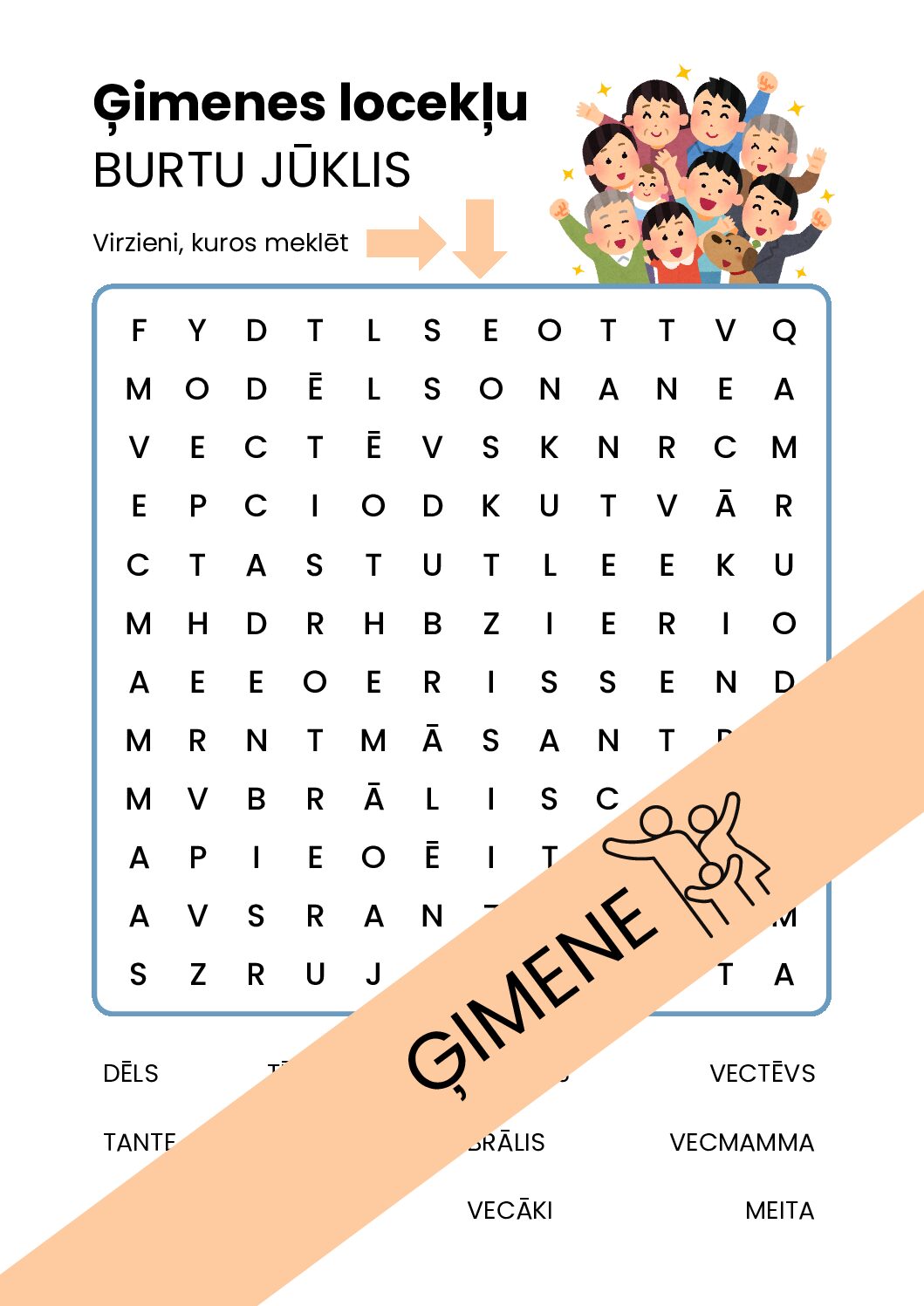 Šajā jūklī ir sajaukti dažādi ģimenes locekļu nosaukumi. Tas ir lielisks veids, kā spēlēt ģimenes tēmu, meklējot paslēptos vārdus.