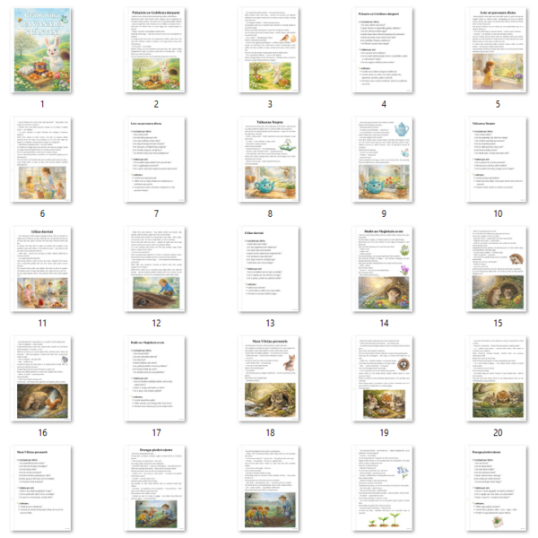 ✔️ Vairāki īsi, viegli uztverami stāsti par pavasari, draudzību un piedzīvojumiem (piemēram, zaķēns Pūkanis, Lilijas dārziņš, ezītis Rūdis u.c.)