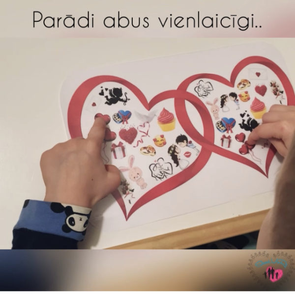 Kartītēs ir divu siržu silueti ar maziem attēliem, kas saistās ar “Sirsniņdienu”. Atrast un vienlaicīgi ar diviem