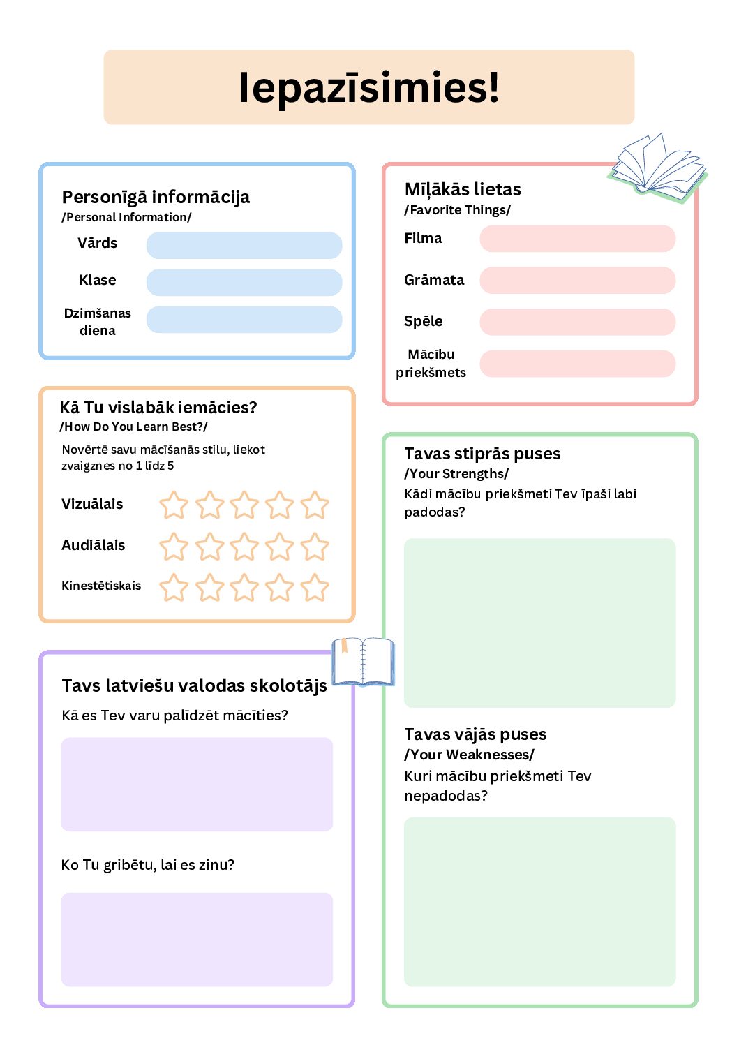 Darba lapa, kas paredzēta, lai iepazītu tuvāk skolēnus klasē.