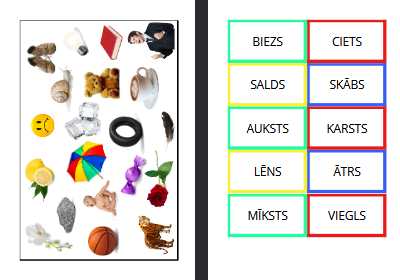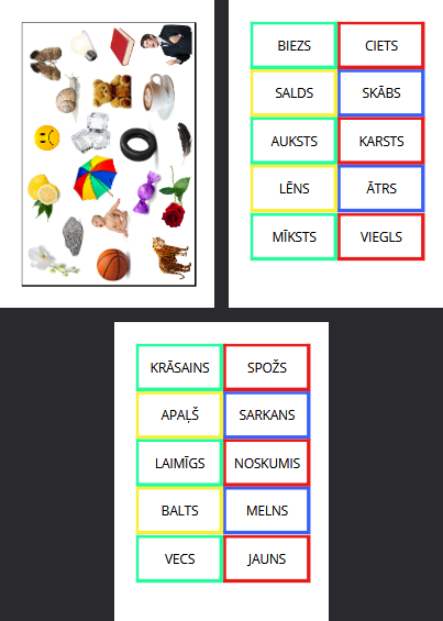 Izprintē attēlus un izgriez īpašības vārdu kartītes. Ņem pa vienai kartītei un atrod īpašības vārdam atbilstošu attēlu, piemēram, sarkana roze. Atzīmē attēlus, ko izdevās atrast.