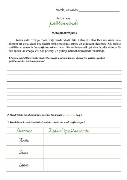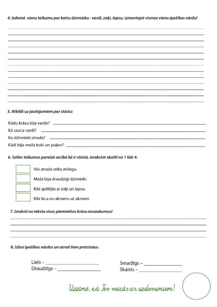 8 uzdevumi, kuri veicina gan teksta izpratni gan attīsta radošumu, kā arī nostiprina zināšanas par īpašības vārdu.