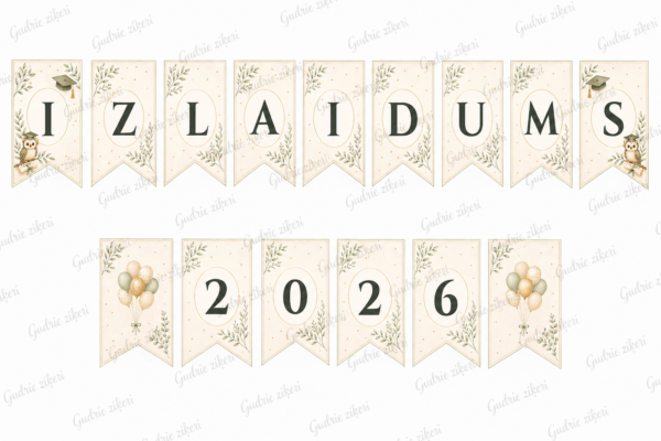 • Karodziņu virtene ar uzrakstu “IZLAIDUMS 2026” (katrs burts un cipars uz atsevišķa karodziņa)