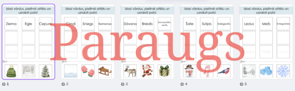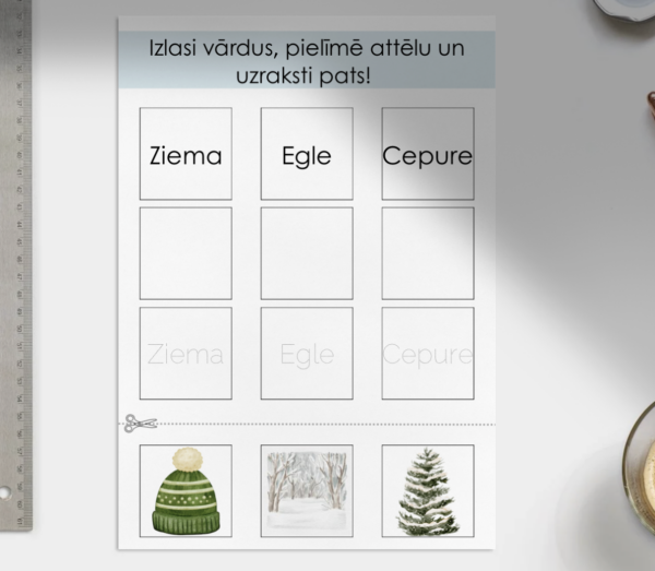 Katrā lapā bērniem jāizlasa 3 ziemas vārdi, jāatrod un jāpievieno attiecīgais attēls, kā arī jāuzraksta vārds pašiem, tādējādi attīstot gan valodas prasmes, gan sīko motoriku un uzmanību.