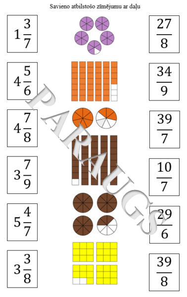 Jāsavieno dotais daļas modelis ar jauktu skaitli un neīstu daļu.