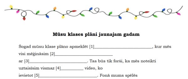 Gaidot jauno gadu kopīgi aizpildiet “Mūsu klases mērķi jaunajam gadam”! Skolēni sauc prasīto lietu, Jūs to ierakstāt lapā un beigās nolasiet, kādi tad būs jūsu mērķi un plāni jaunajam gadam!