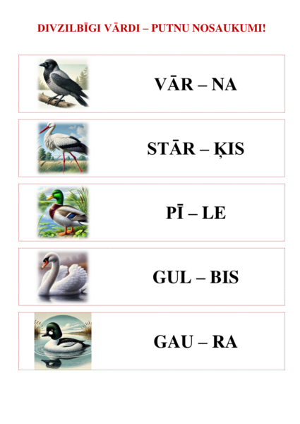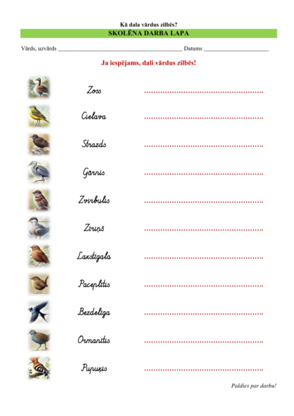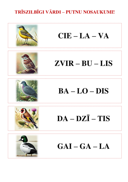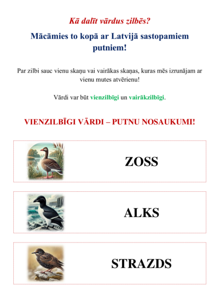 Mācību materiāls palīdz bērniem kā mācīties dalīt vārdus zilbēs, tā arī iepazīt parastus un ne tik parastus Latvijā sastopamus putnu nosaukumus! Materiāls sastāv no 12 rediģējamām un papildināmām A4 formāta lapām doc un pdf formātā, sniedzot iespēju iepazīt 100 vienzilbīgus, divzilbīgus, trīszilbīgus un četrzilbīgus putnu nosaukumus, kopā ar darba lapu (lielie un rakstītie burti).