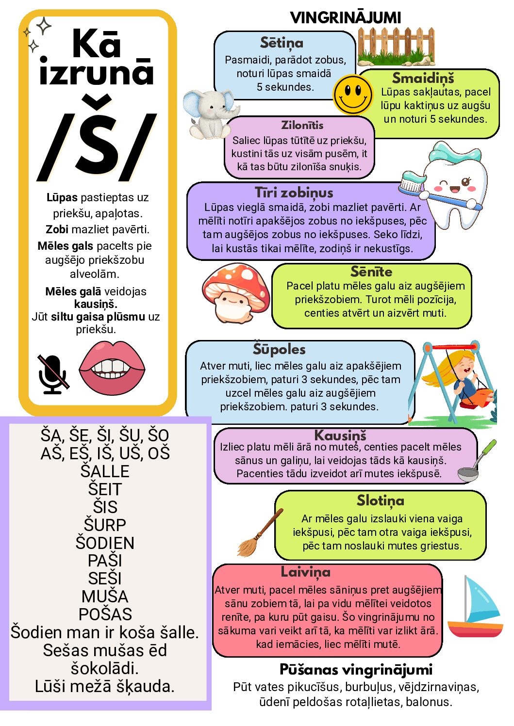 Atgādņu kartītes 16 skaņu (S, T, C, DZ, D, Z, R, L, Š, Ž, Č, Ļ, Ņ, Ķ, Ģ, J) izrunai. Katrā kartītē ir īsa atgādne, kādā pozīcijā atrodas lūpas un mēle, lai pareizi izrunātu konkrēto skaņu. Klāt pievienoti vingrinājumu apraksti ar bildītēm bērnam un vecākam saprotamā valodā.