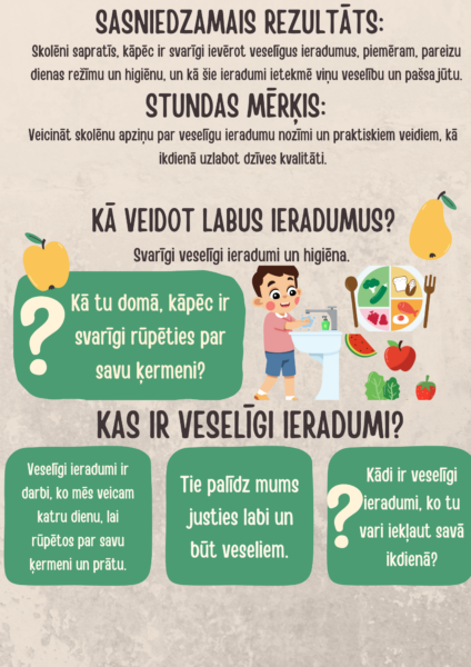 - Darba lapu, kas palīdz skolēniem izvēlēties veselīgus ieradumus un izprast to nozīmi ikdienā.