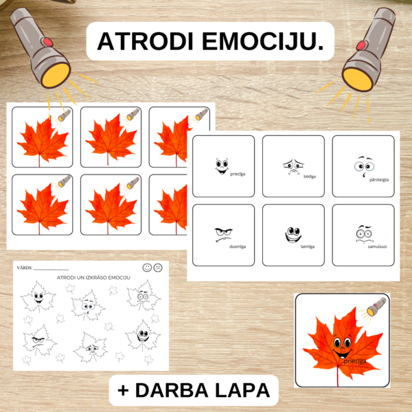 🟡 Materiāls – kāda emocija paslēpās lapiņā? Papildus darba lapa, lai bērns atrod emociju lapiņā un darba lapā izkrāso atrasto emociju.