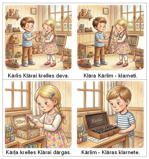 Attēlu sērija mēles mežģa “Kārlis Klārai krelles deva, Klāra Kārlim klarneti” apguvei.