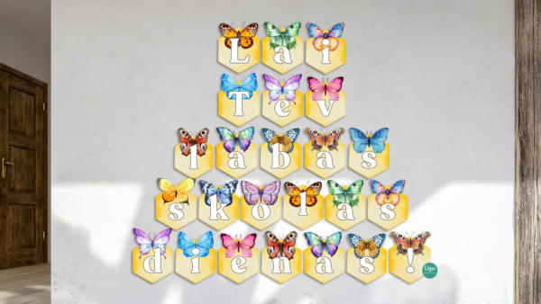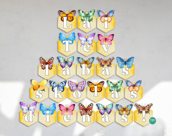 Krāsaini karodziņi ar akvareļu stila tauriņiem, kas kopā veido uzrakstu: