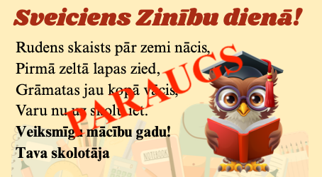 Digitālās kartītes “Sveiciens Zinību dienā!” ar dzejolīti būs jauks pārsteigums pirmajā skolas dienā. Var lejupielādēt, izprintēt un nolikt uz galda kā mazu sveicienu, lai iepriecinātu skolēnus.