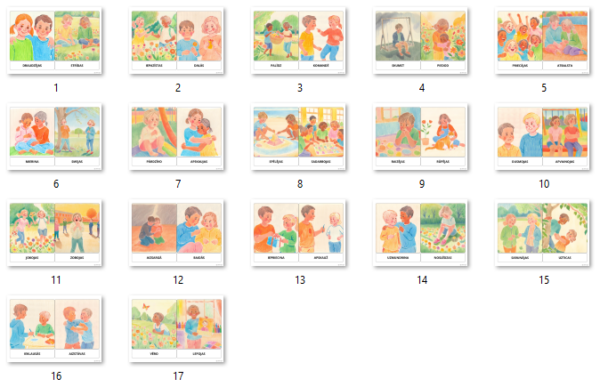 Šis materiāls sastāv no 34 kartītēm (PDF formātā), kas palīdz bērniem izprast draudzību, emocijas un attiecības dažādās situācijās.