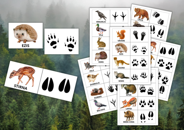 Katrā kartītē attēlots dzīvnieks un tam atbilstošais pēdu nospiedums