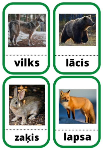 Kartītes par meža dzīvnieku tematiku lasītprasmes apguvei, jaunu vārdu apguvei.