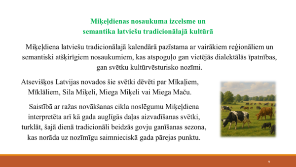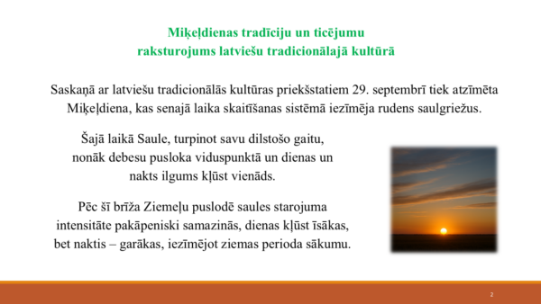 Mācību prezentācija par Miķeļdienas nozīmi, ticējumiem, tradīcijām, tautasdziesmām u.c. Rediģējama pptx formātā, 42 animēti un ar attēliem papildināti slaidi. Papildus rediģējamā doc un drukājamā pdf formātā teksta un attēlu kopsavilkums skolotājam (10 A4 formāta lapas) un 1 krāsojama, rediģējama darba lapa ar 6 dažādiem krāsojamiem ornamentiem.