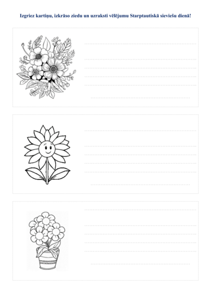 2. Skolēnu apsveiku veidošanas lapas (krāso, raksti) – 6 A4 (doc un pdf) formāta lapas, uz katras lapas 3 dažādi apsveikumu ziedu zīmējumi krāsošanai;