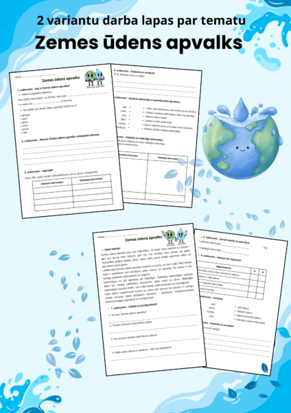 Darba lapas 3. klasei par tēmu “Zemes ūdens apvalks”. Ietver dažādus uzdevumus: jēdzienu izpratni, ūdenstilpju klasifikāciju, lasāmo tekstu ar jautājumiem un radošo uzdevumu. Piemērots mācību stundām un pārbaudes darbam.