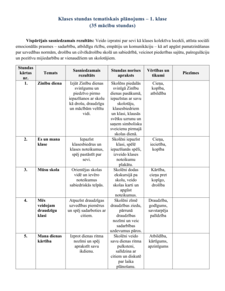 Klases stundu tematiskais plānojums 1. klasei paredzēts 35 mācību stundām. Rediģējamā un papildināmā doc formātā un drukājamā pdf formātā. 6 A4 formāta lapas, paredzot klases stundu vispārīgo sasniedzamo rezultātu, klases stundas tematu, īsu skolēnu darbības aprakstu, vērtības un tikumus un STAP.