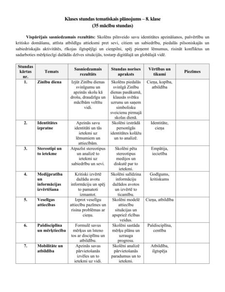 Klases stundu tematiskais plānojums 8. klaseiKlases stundu tematiskais plānojums 8. klasei