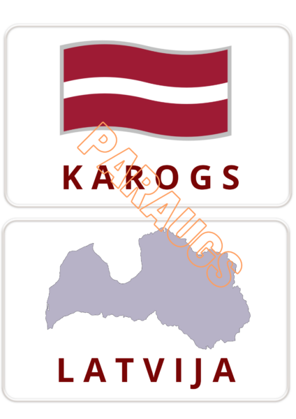 Printējamas kartiņas uz A4 lapas 2 gb. Vienas kartiņas izmērs A5. Kartiņās attēloti Latvijas simboli un to nosaukumi – karogs, dzintars, Daugava, brīvības piemineklis, baltā cielava, Latvijas karte, Rīga, divpunktu mārīte, liepa, ozols, pīpene.